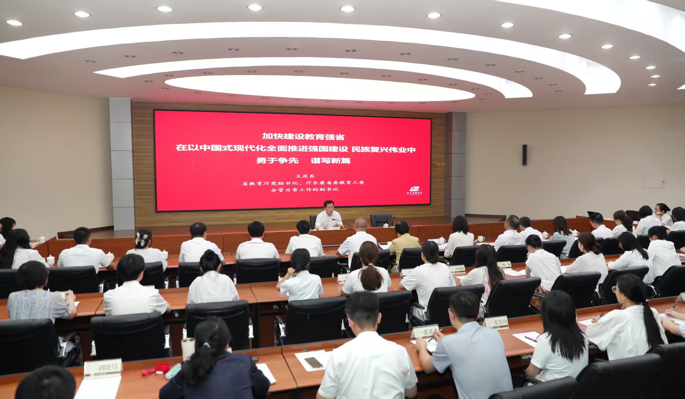 王庆东指出,省委省政府高度重视教育工作,在实施全面振兴新突破三年行动中谋划和推进教育强省建设,我省教育现代化走在了全国前列,教育强省建设已经站上了新的历史起点。今年5月,省委省政府印发《辽宁教育强省建设规划纲要》,明确到2035年建成教育强省的目标任务。我们要在省委省政府领导下,坚定拥护“两个确立”、坚决做到“两个维护”,深入贯彻习近平总书记关于教育的重要讲话精神和全国教育大会精神,以落实《纲要》各项任务为抓手,扎实推进教育强省建设,在推动新时代东北全面振兴取得新突破上勇于争先、谱写新篇。