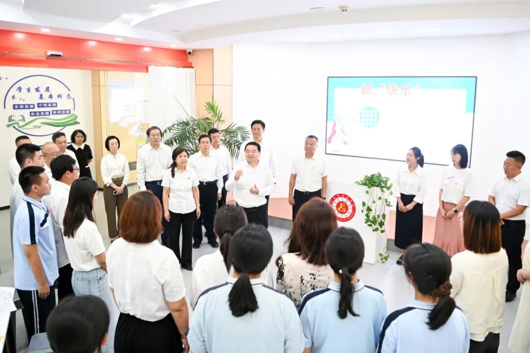 郝鹏在主教学楼内详细了解校史沿革、教育教学、师资队伍等情况,对学校坚持特色办学取得的成绩给予肯定。学生发展指导中心是学校为学生们打造的多元综合指导基地,当日教师们正在这里给学生上心理课,新颖的教学方式、轻松的教学氛围让学生们身心愉悦,课堂上不时传来阵阵笑声。郝鹏仔细观摩教学,在课程间歇与教师们亲切交流,向他们的辛勤付出表示感谢,勉励大家强化特色教育,用心用情呵护引导孩子们健康成长。他要求学校不断改善教学条件,为广大师生工作学习创造更优环境。
